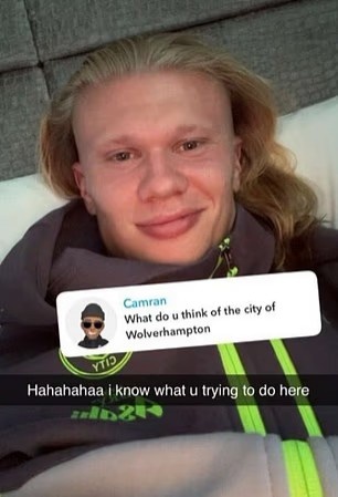 在曼城对阵狼队的比赛前,哈兰德晒出在伍尔弗汉普顿的自拍定位。当被球迷问及对该城市的看法时,这位挪威射手回复:"笑死,我懂你什么意思。"